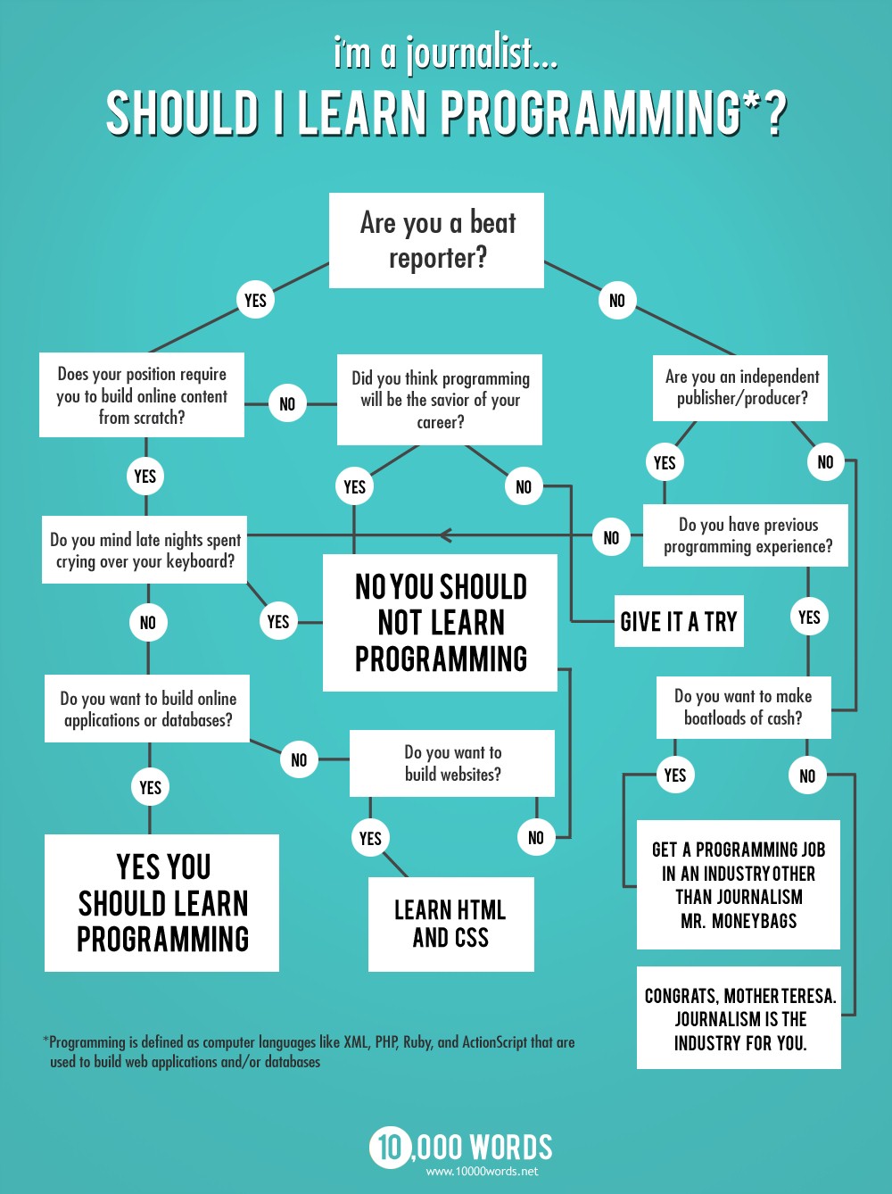 – Diagrama del debate sobre si los periodistas deberían aprender programación. Te lo puedes descargar en 10,000 Words.
